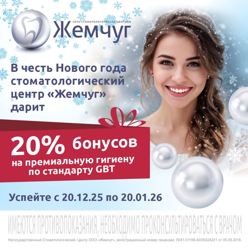 В честь Нового года стоматологический центр «Жемчуг» (пр. Ленина, д. 84а) дарит 20% бонусов на премиальную гигиену по стандарту GBT. Успейте с 20/12/2025 по 20/01/2026, сделайте профессиональную гигиену по стандарту GBT в этот период и получите 20% бонусов на следующую профессиональную гигиену по стандарту GBT. Бонусы действительны до 20/06/2026.
