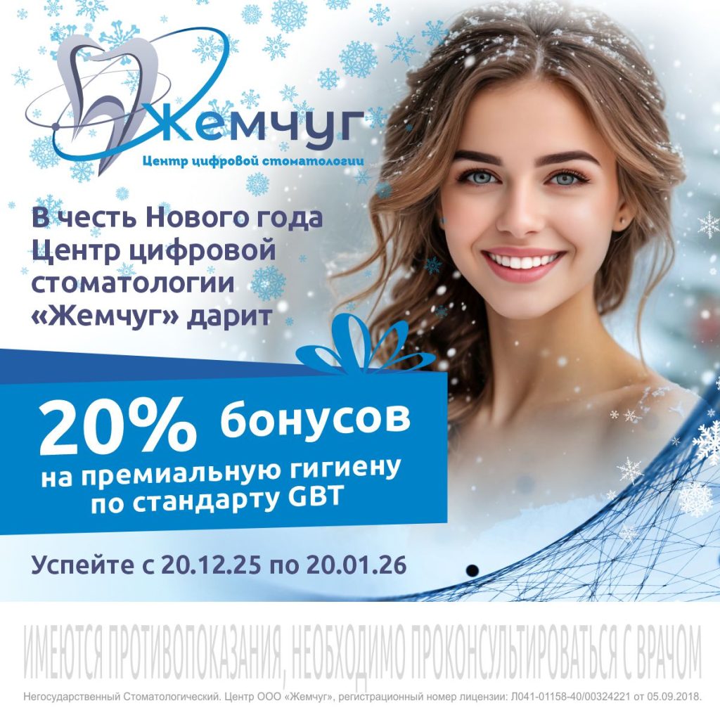 В честь Нового года Центр цифровой стоматологии «Жемчуг» (ул. Белкинская, д. 44) дарит 20% бонусов на премиальную гигиену по стандарту GBT. Успейте с 20/12/2025 по 20/01/2026, сделайте профессиональную гигиену по стандарту GBT в этот период и получите 20% бонусов на следующую профессиональную гигиену по стандарту GBT. Бонусы действительны до 20/06/2026.