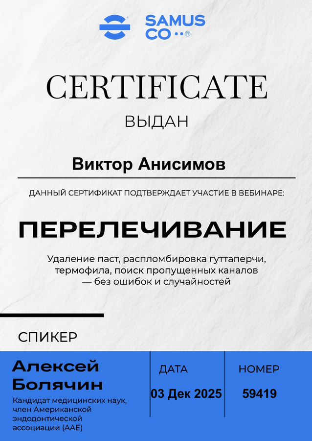 2025 г. – «ПЕРЕЛЕЧИВАНИЕ. Удаление паст, распломбировка гуттаперчи, термофила, поиск пропущенных каналов – без ошибок и случайностей» (А. Болячин).