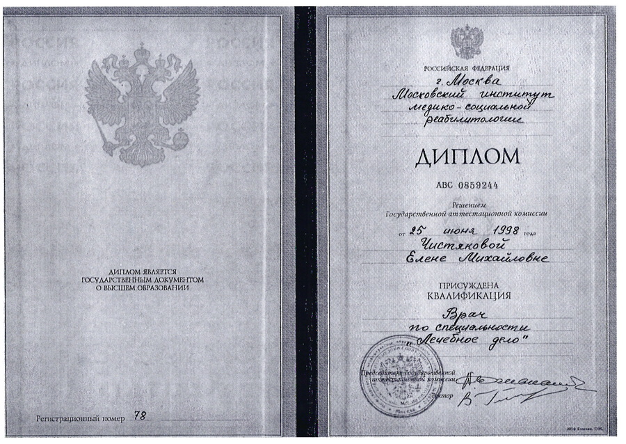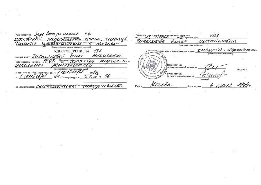 1999 г. – прошла интернатуру, присвоена квалификация врача хирурга-стоматолога, выдано удостоверение № 138 Московским медицинским стоматологическим институтом.