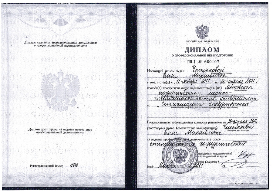 2011 г. – прошла профессиональную переподготовку в Московском государственном медико-стоматологическом университете по «Стоматологии хирургической».