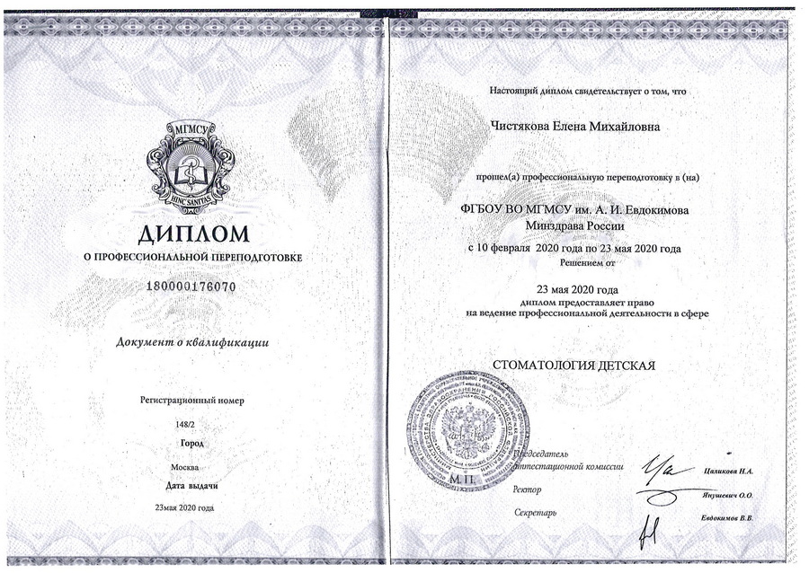 2020 г. — прошла профессиональную переподготовку в ФГБОУ ВУ МГМСУ им. А.И. Евдокимова Минздрава России по «Стоматологии детской».