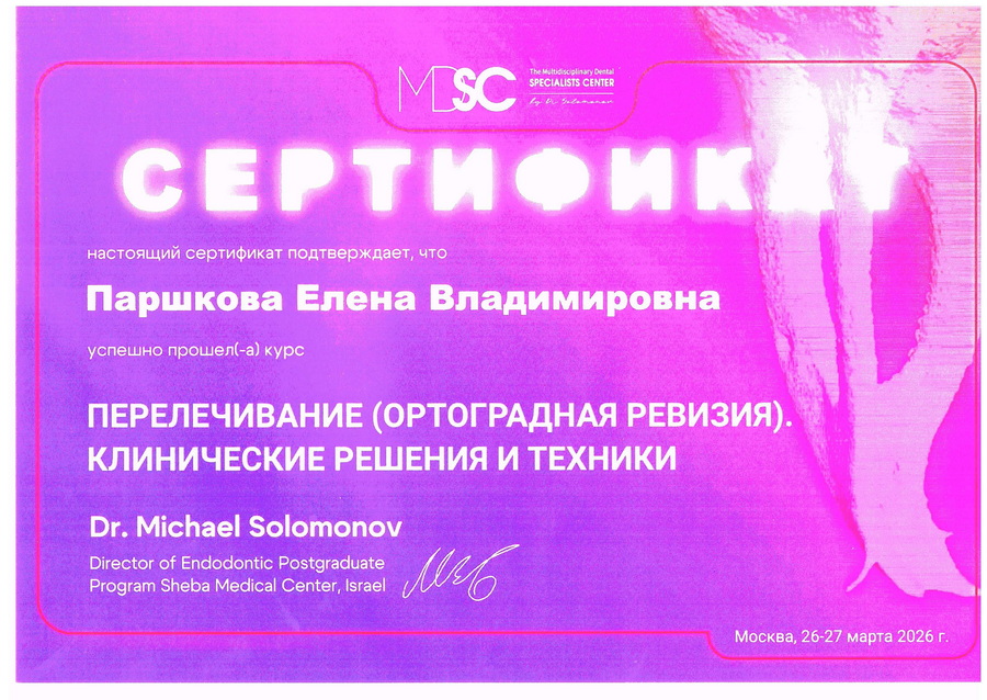 2020 г. — участник мастер-класса дипломированного специалиста по эндодонтии Михаила Соломонова «Extreme in Endodontics: C-shape canals».